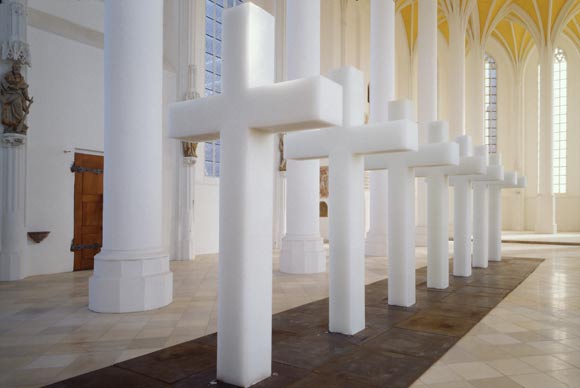 Robert Longo markiert mit sieben monutalen Wachs-kreuzen im Sommer 1998 in der Landshuter Heilig-geistkirche einen Kreuzweg. Wie selbstleuchtende Körper schmückten sie den hellen gotischen Kirchenraum. Longos Installation wurde von 60 000 Besuchern gesehen.